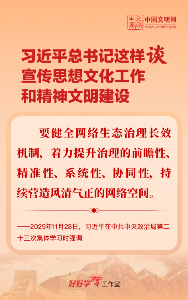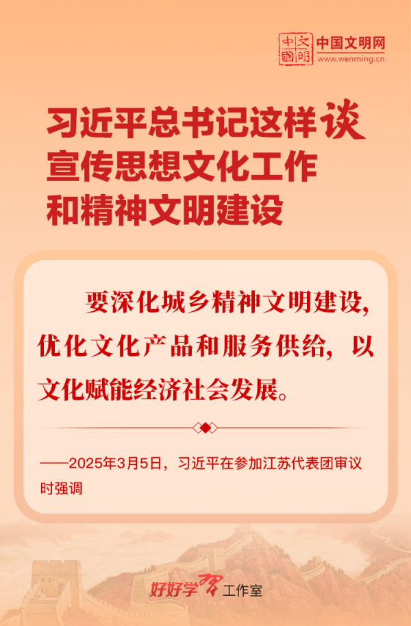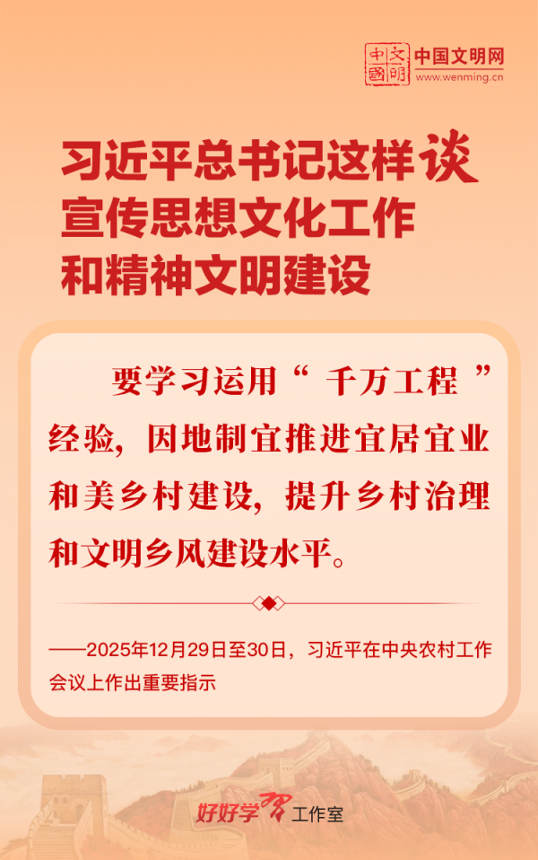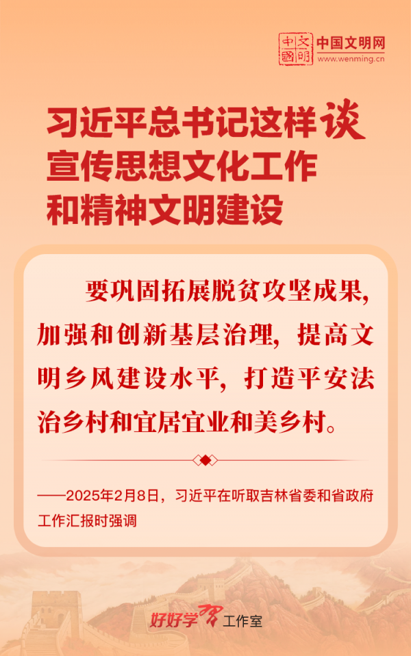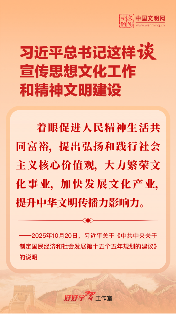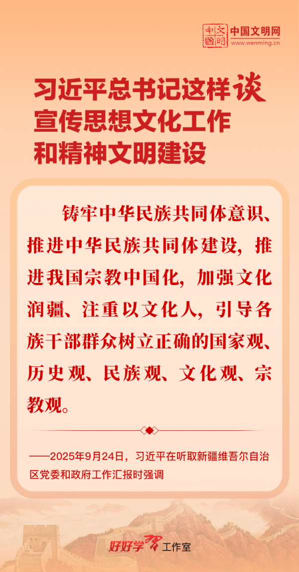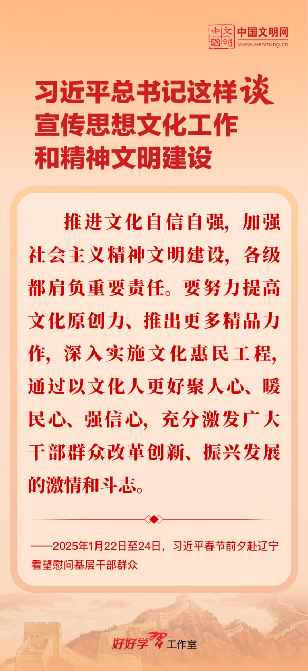 習(xí)近平總書記高度重視宣傳思想文化工作和精神文明建設(shè),念茲在茲、飽含期許。2025年,習(xí)近平總書記對(duì)宣傳思想文化工作和精神文明建設(shè)作出一系列新的重要指示,發(fā)表一系列重要論述。本網(wǎng)從這一年的頭條報(bào)道中輯錄部分內(nèi)容,讓我們一起深入學(xué)習(xí)領(lǐng)會(huì),更加自覺學(xué)習(xí)貫徹習(xí)近平文化思想,更好擔(dān)負(fù)起新時(shí)代的文化使命。