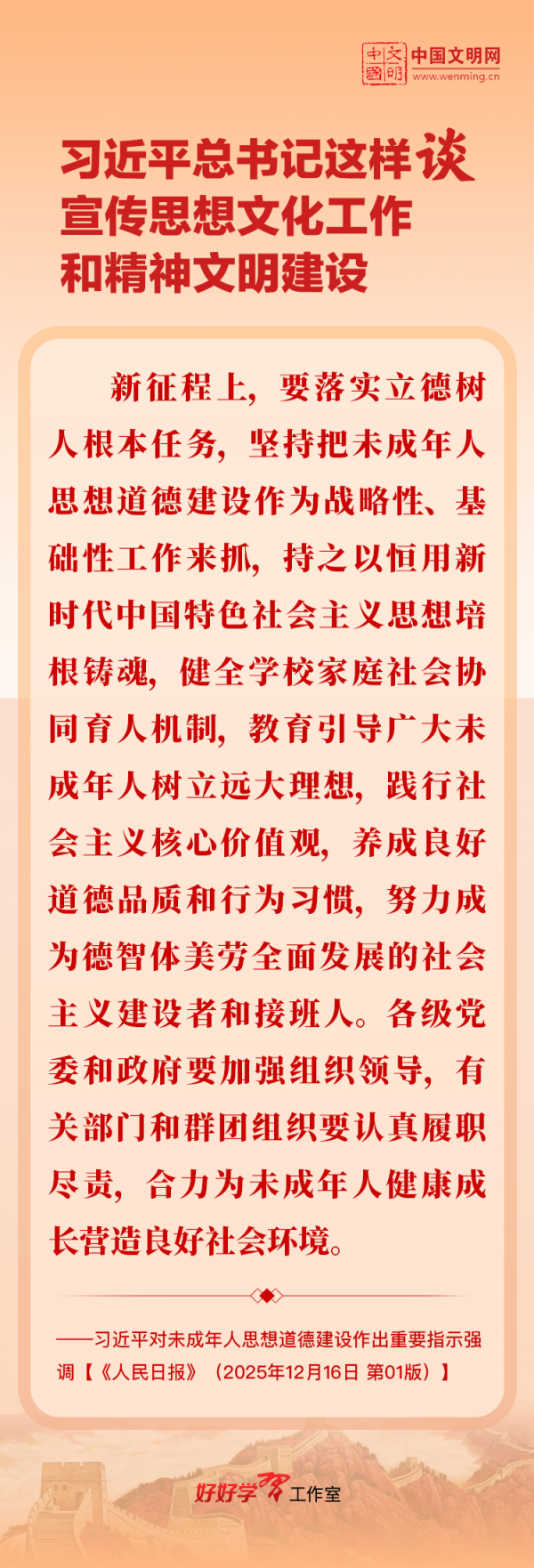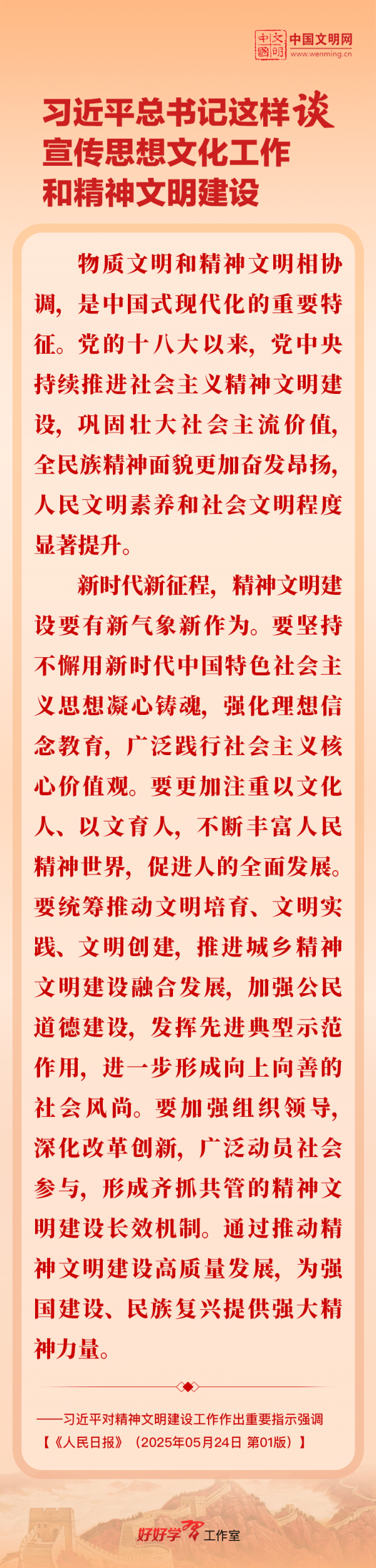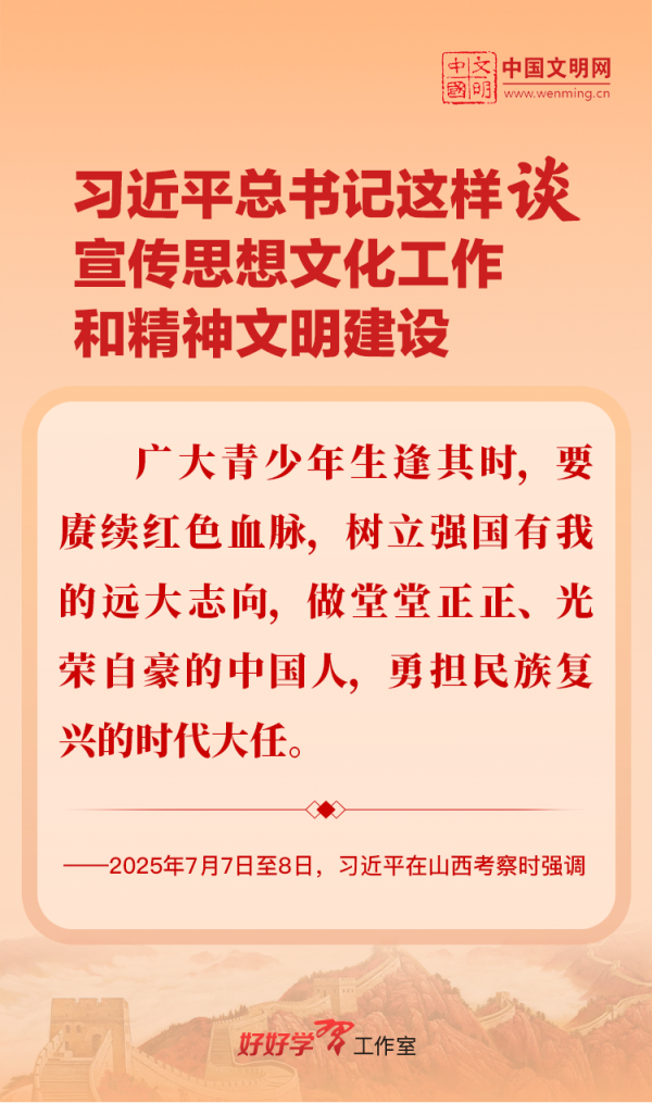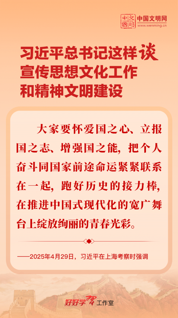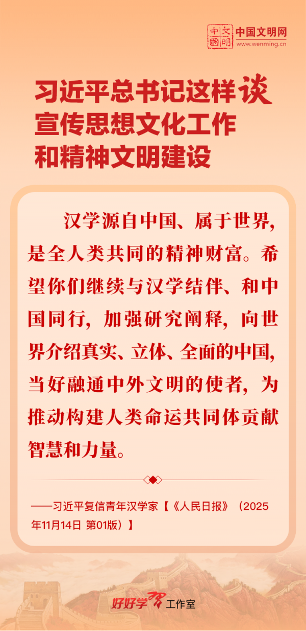 習(xí)近平總書記高度重視宣傳思想文化工作和精神文明建設(shè),念茲在茲、飽含期許。2025年,習(xí)近平總書記對(duì)宣傳思想文化工作和精神文明建設(shè)作出一系列新的重要指示,發(fā)表一系列重要論述。本網(wǎng)從這一年的頭條報(bào)道中輯錄部分內(nèi)容,讓我們一起深入學(xué)習(xí)領(lǐng)會(huì),更加自覺學(xué)習(xí)貫徹習(xí)近平文化思想,更好擔(dān)負(fù)起新時(shí)代的文化使命。