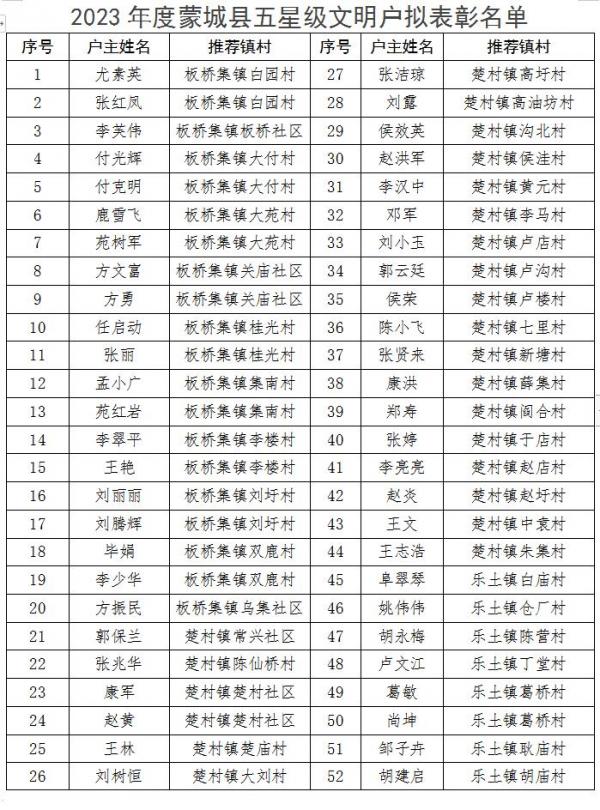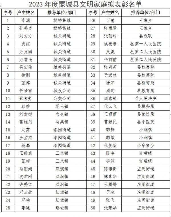 為深入貫徹習(xí)近平總書記關(guān)于“注重家庭、注重家教、注重家風(fēng)”的重要指示精神,加強(qiáng)改進(jìn)基層宣傳思想文化工作和精神文明建設(shè),引導(dǎo)群眾自我管理、自我教育、自我提升,根據(jù)《安徽省文明家庭創(chuàng)建標(biāo)準(zhǔn)和推選辦法》(皖文明〔2020〕7號)《關(guān)于在全市農(nóng)村廣泛開展五星級文明戶創(chuàng)建評選活動的指導(dǎo)意見》(亳文明發(fā)〔2016〕4號)精神,結(jié)合我縣新時代文明實踐中心建設(shè)工作,縣文明辦面向城鄉(xiāng)開展了“文明家庭”“五星級文明戶”創(chuàng)建評選活動。經(jīng)深入宣傳、廣泛發(fā)動,各鄉(xiāng)鎮(zhèn)、街道、縣直單位推薦,文明辦審核等程序,確定出了50戶家庭為2023年度蒙城縣文明家庭擬表彰名單,308戶家庭為2023年度蒙城縣五星級文明戶擬表彰名單。